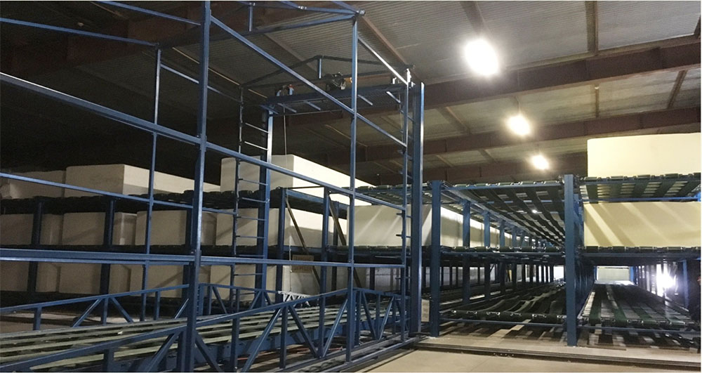 海綿立體倉(cāng)庫(kù)用于儲(chǔ)存剛發(fā)泡出來(lái)未完全熟化的海綿,可以儲(chǔ)存長(zhǎng)條海綿及短泡,可以配套移動(dòng)輸送線或者移動(dòng)倉(cāng)庫(kù),以便可以讓海綿進(jìn)入倉(cāng)庫(kù)的每一個(gè)倉(cāng)位,倉(cāng)庫(kù)每個(gè)輸送線可以獨(dú)立與前輸送線同步,通過(guò)PLC與人機(jī)界面,可以實(shí)現(xiàn)海綿自動(dòng)進(jìn)入指定倉(cāng)庫(kù)和從指定倉(cāng)庫(kù)輸送出海綿,使用此系統(tǒng)可以加快海綿降溫,保證海綿的質(zhì)量,同時(shí)節(jié)省大量人力。